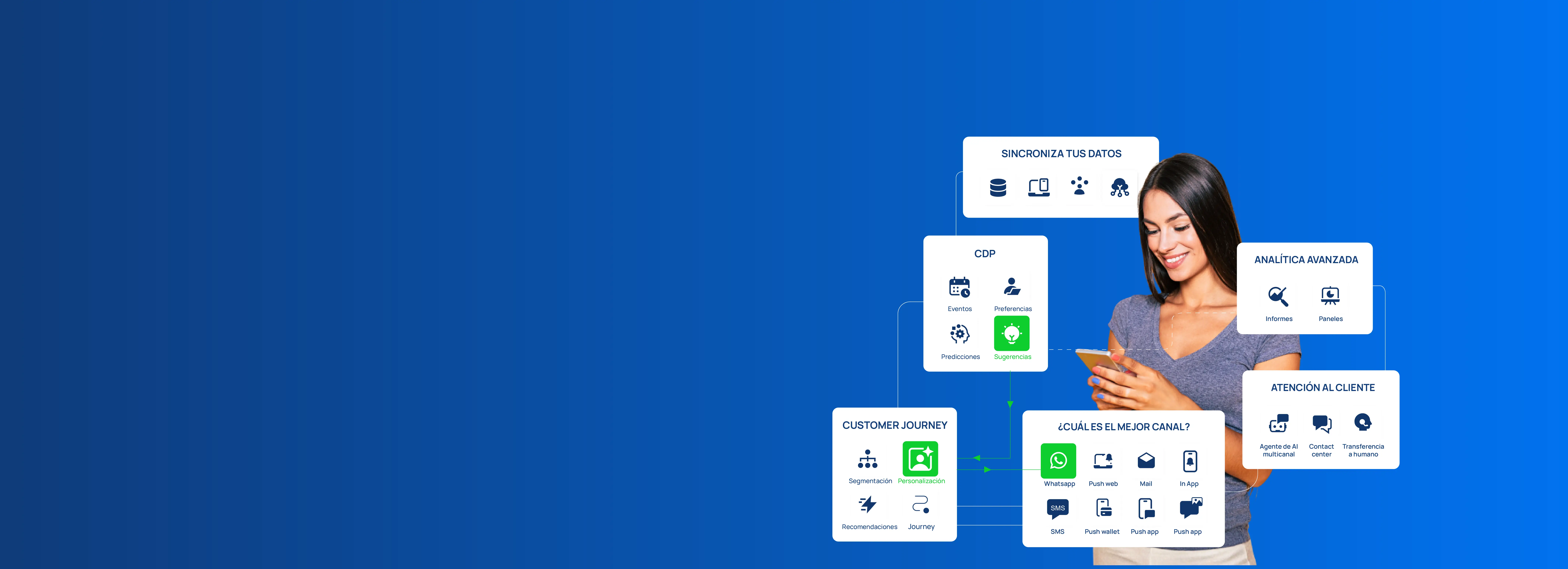 Conecta con tus clientes a través de canales, asegurándote de que tus mensajes no solo sean oportunos sino también impactantes.