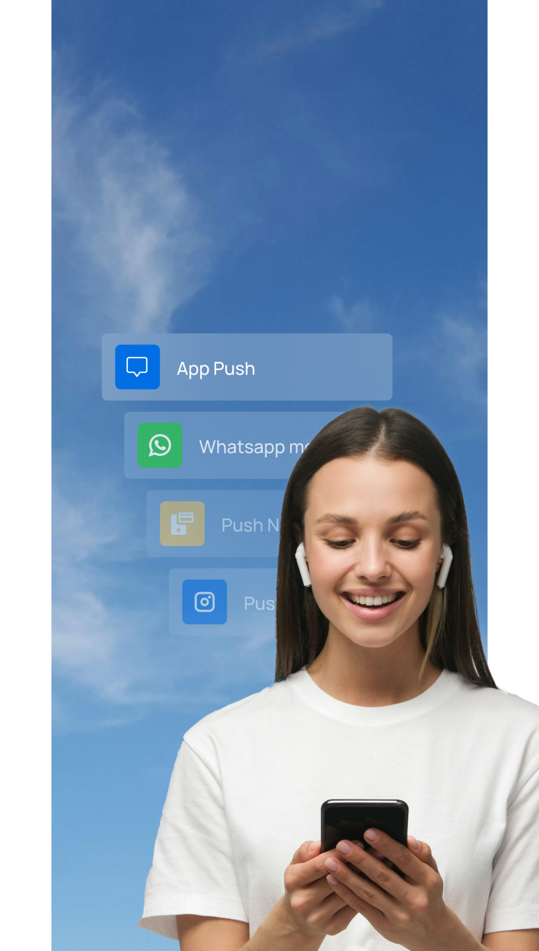 - Integración omnicanal: Integra a la perfección las notificaciones push con otros canales como Whatsapp, correo electrónico y SMS para optimizar el recorrido de tus clientes.